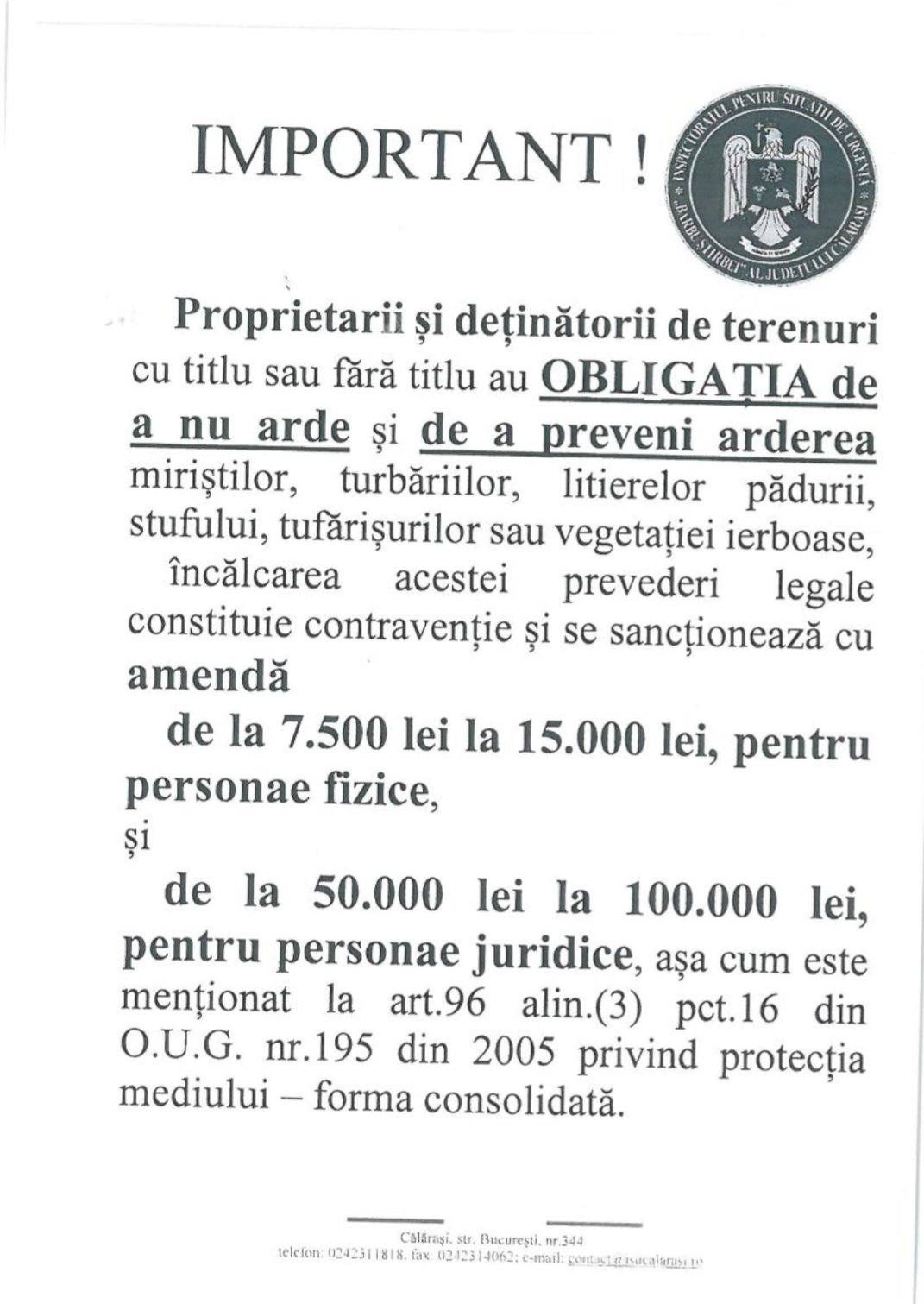 ℹ Având în vedere creșterea semnificativă a numărului de incendii produse în ultima perioadă la vegetația uscată, plantații, ca urmare a utilizării focului deschis pentru curățarea terenurilor, vă rugăm să respectați următoarele măsuri în scopul prevenirii incendiilor de vegetație: